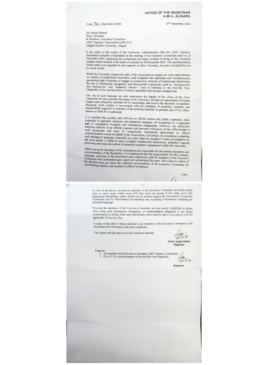 अलीगढ़।। अलीगढ़ मुस्लिम विश्वविद्यालय (एएमयू) के रजिस्ट्रार प्रो. आसिम ज़फ़र ने एएमयू टीचर्स एसोसिएशन (AMUTA) के मानद सचिव अशरफ़ मतीन और कार्यकारिणी समिति को कड़ी फटकार लगाते हुए कारण बताओ नोटिस जारी किया है। यह नोटिस 25 दिसंबर 2025 को हुई एएमयू टीचर्स एसोसिएशन की कार्यकारिणी बैठक में पारित उस प्रस्ताव से जुड़ा है, जिसमें 24 दिसंबर 2025 को विश्वविद्यालय परिसर में हुई गोलीबारी की घटना और एक शिक्षक की मृत्यु के संदर्भ में विश्वविद्यालय प्रशासन की आलोचना की गई थी।